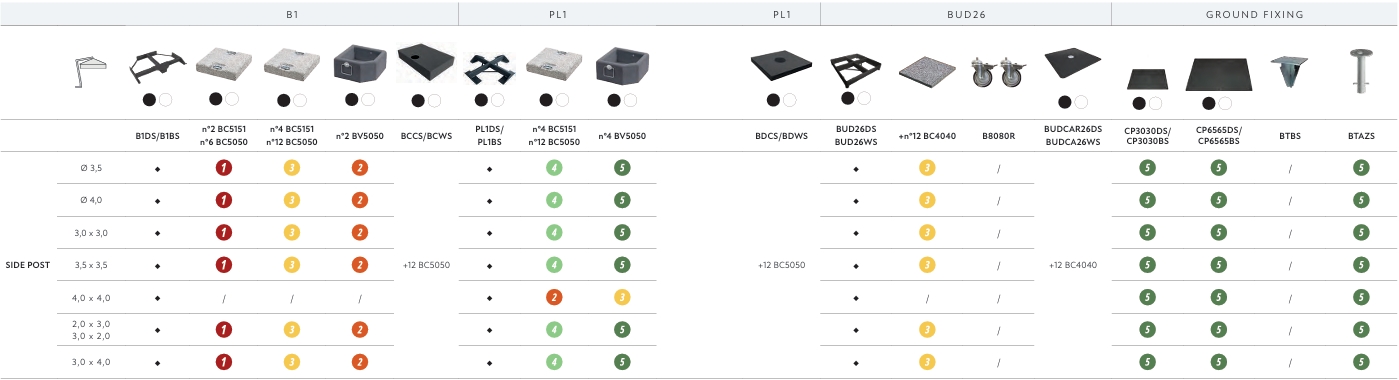 - B1BS - Use this base bearing in mind our recommendation to have a stability factor of 3 or more. We suggest 1 set of 2 BC5151 AND 1 set of 2 BV5050. Alternatively use 12 x BC5050. This base unit can be partially hidden with BCWS Carter Parasol Base Cover.